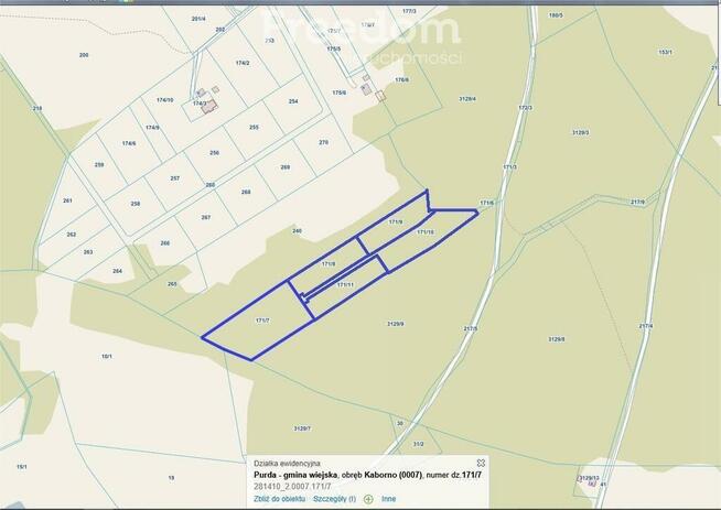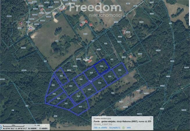 Teren pod lasem o pow. około 10 ha podzielony na działki. Do jeziora Łęsk ok. 1 km.